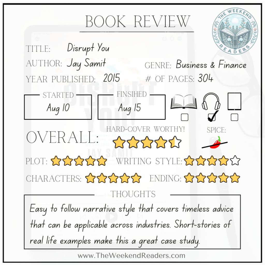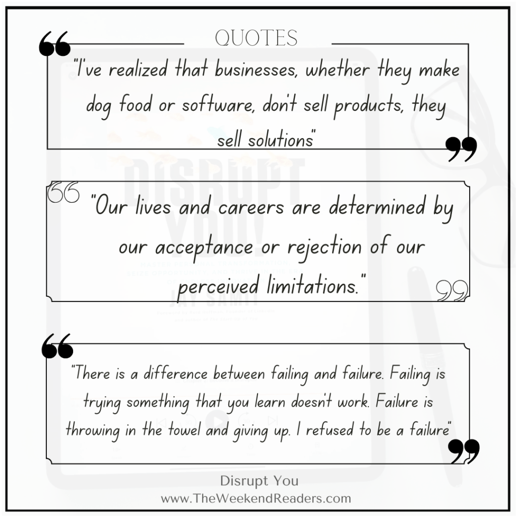 Throughout Disrupt You, digital media innovator Jay Samit explores how to harness disruption as a tool for growth. Drawing on his own experiences in the tech industry, Samit shares strategies for identifying opportunities, challenging conventional thinking, and turning obstacles into advantages. The book combines practical advice, case studies, and motivational insights to help readers reinvent themselves, launch innovative businesses, and thrive in an era of constant change. Ultimately it drives home the idea that Disruption isn’t about what happens to you, it’s how you respond to what happens to you that defines who you are and what you are capable of creating.
