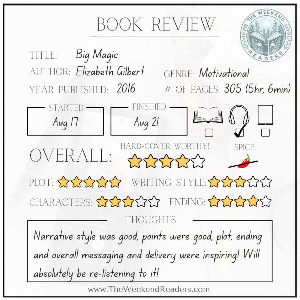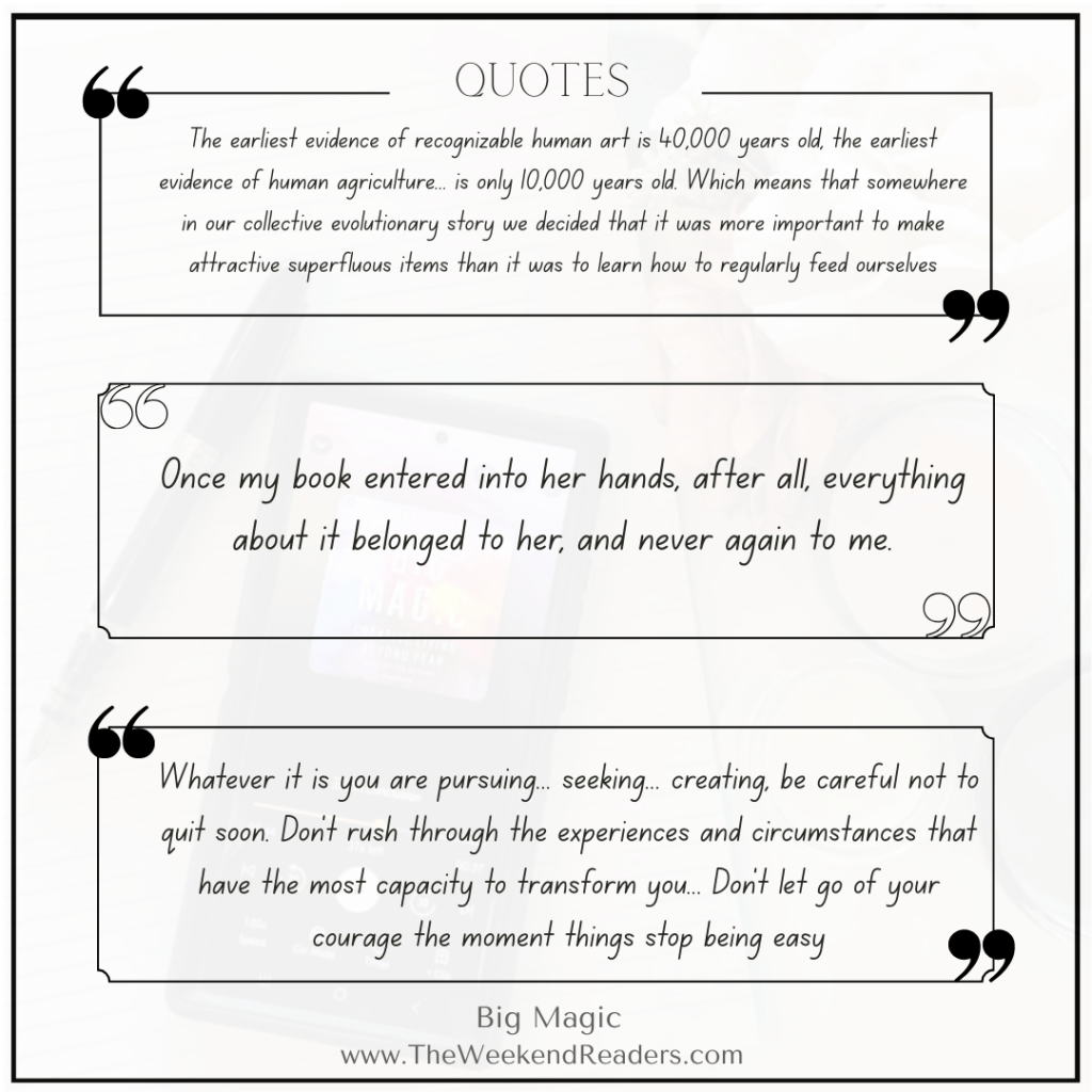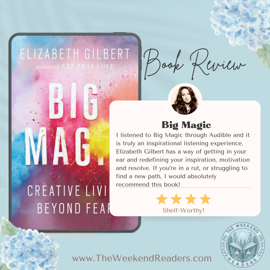 I have to say, I was absolutely entranced listening to Elizabeth Gilbert narrate her book ‘Big Magic’. I’ve never actually read ‘Eat, Pray, Love’, and I’d never heard about any of her other books, but this one found me, right when it was supposed to, and I can’t imagine falling any more in love with her other books than I did this one.