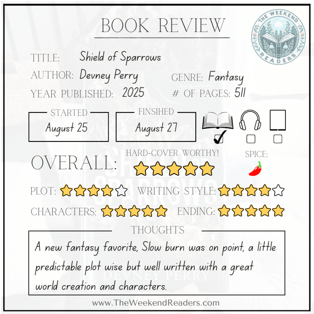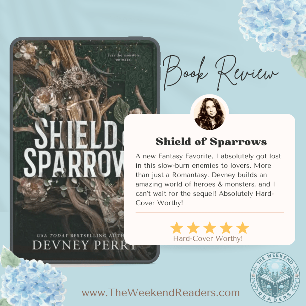 Shield of Sparrows by Devney Perry is a romantasy about Odessa Cross, the overlooked princess suddenly forced into a political marriage meant for her sister. Thrust into enemy territory and tasked with espionage, she finds herself torn between duty and the pull of a mysterious monster hunter.