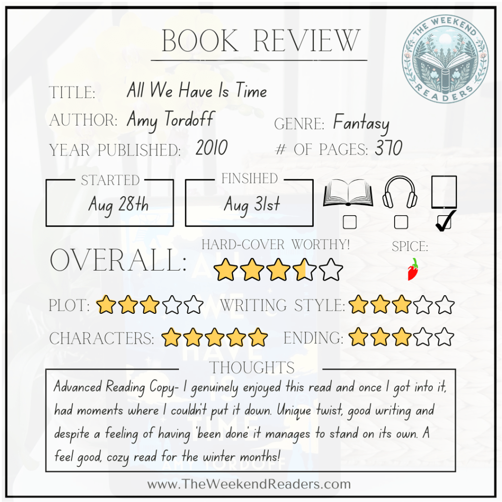 ‘All We Have Is Time’ is an enchanting debut novel that blends historical romance, fantasy, and time travel into one cute read, I think you’ll enjoy!