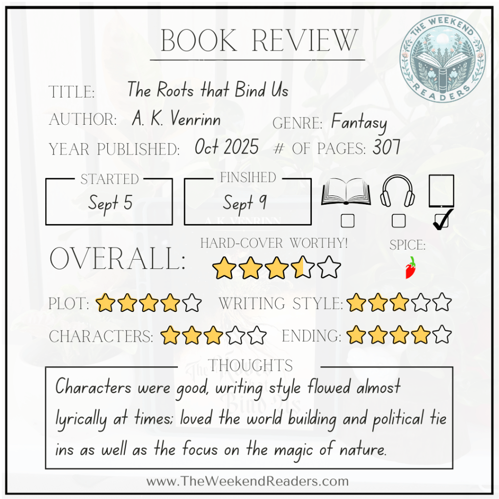This Advanced Reading Copy, The Roots that Bind Us, happened to be perfect for the mood and was a perfect match for me this week!