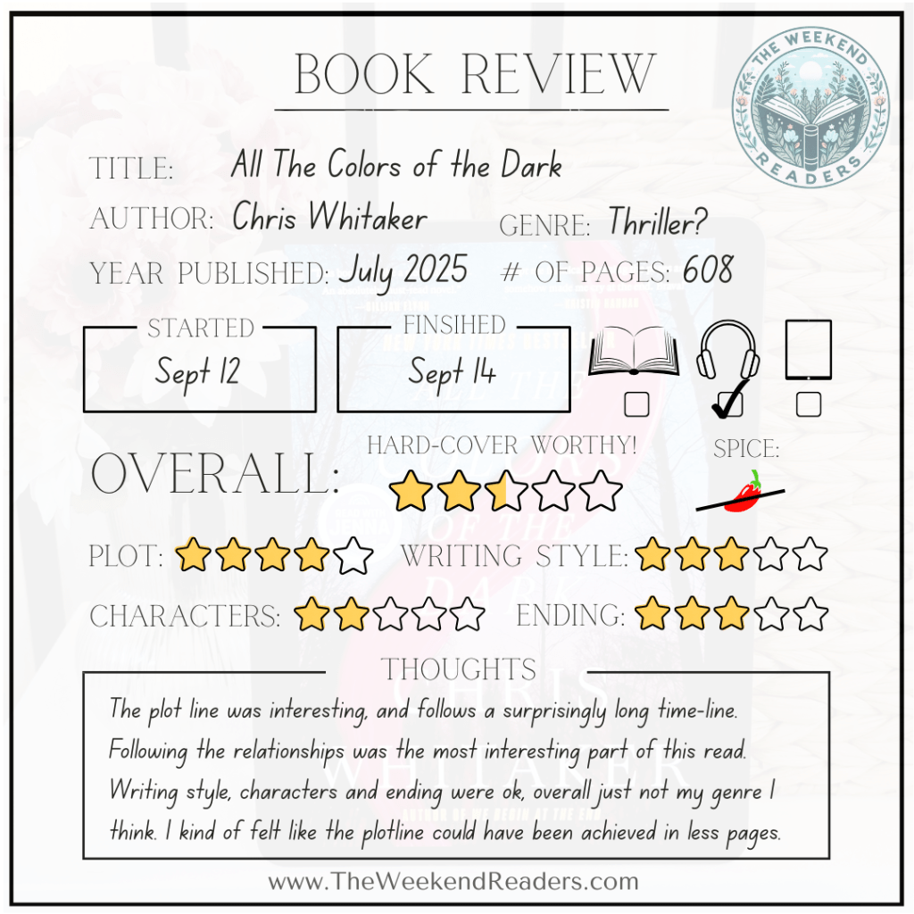 While I admired the scope of the story and how the characters lives and relationships continue to twine and overlap over time, I found it slower than expected and sometimes weighed down by its length. I didn’t sense any ‘thrill’ and it all felt a little flat, while I did appreciate the idea of the plot, overall it was just kind of ok and hype just didn’t add up for me.