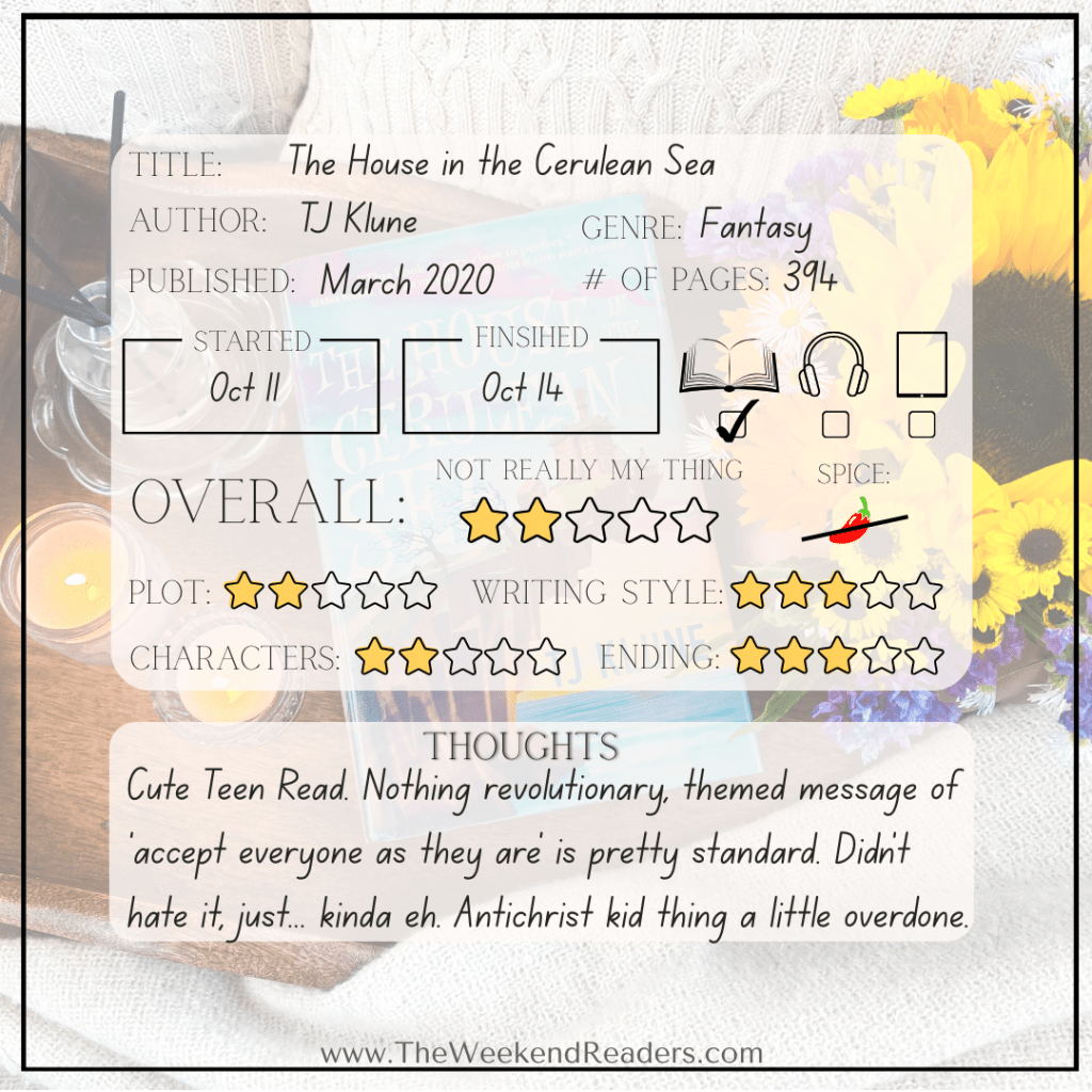 As I said, it just fell a little flat. The writing was basic, the world building was not quite there, the characters of the children felt like an afterthought to the case worker and the caretaker, and the message felt… dragged out? While I love a good story of acceptance and taking people as they are, the ‘antichrist child can be good’ scheme felt a little lack luster. I haven’t heard of or read any of TJ’s other books, and this would definitely put me on the fence unless I found one that really stood out to me.