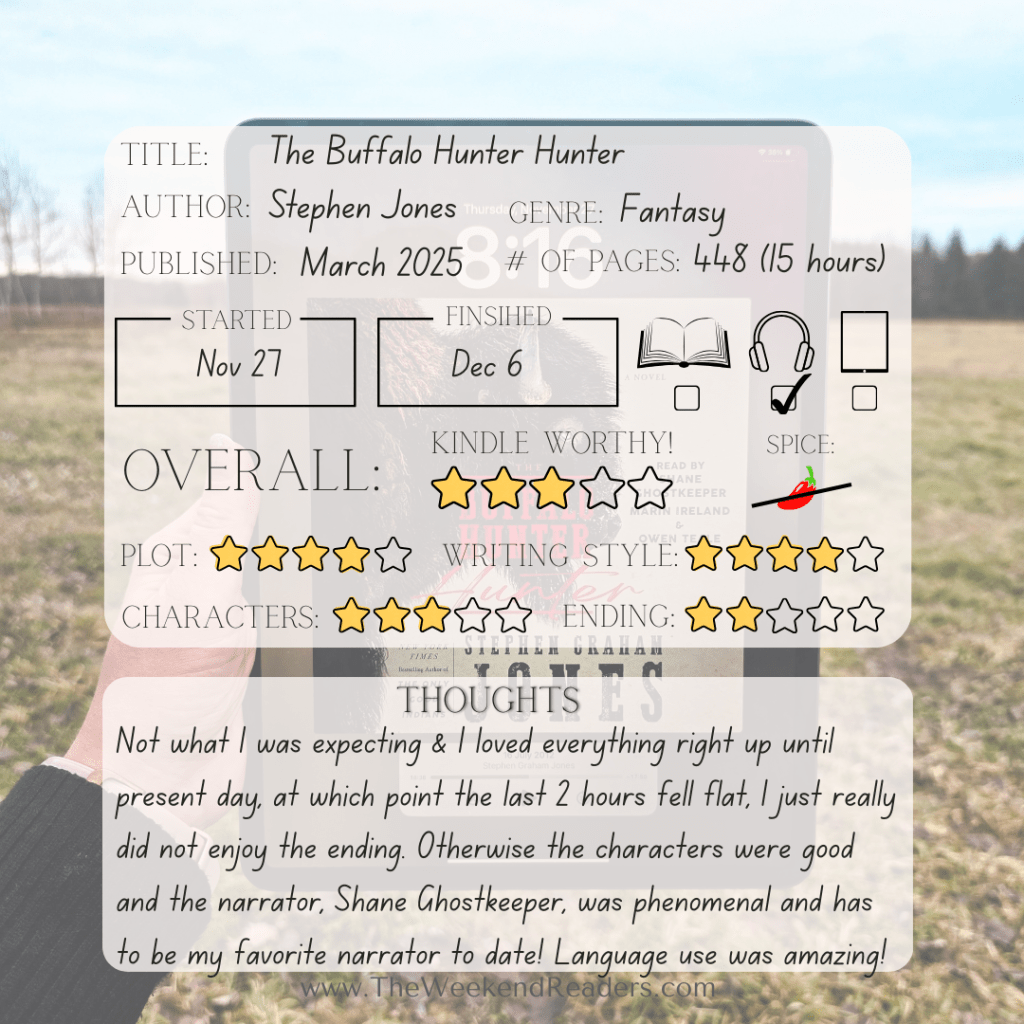 Last month I started listening to the audio version of The Buffalo Hunter Hunter and it was not what I expected. To be honest, I wasn’t really sure about another novel from Stephen Jones as his previous novel, ‘The Only Good Indians‘, strayed a little further into the horror genre than I normally go, but I’m so happy I picked his most recent novel up!